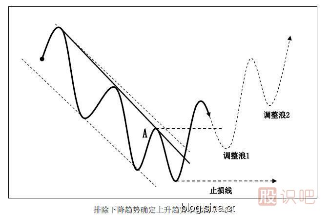 圖【排除下降趨勢(shì)確定上升趨勢(shì)示意圖7-53】中,價(jià)格已經(jīng)突破了下降趨勢(shì)線、拐點(diǎn)線和分界點(diǎn)A,根據(jù)趨勢(shì)交易法的假設(shè),我們此時(shí)排除了之前下降趨勢(shì)發(fā)生的可能性,確認(rèn)未來(lái)將展開(kāi)上升趨勢(shì),如圖【排除下降趨勢(shì)確定上升趨勢(shì)示意圖7-54】所示。