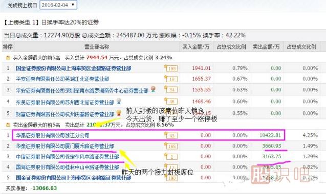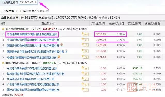 龍虎榜,2016年2月4日,賣方營(yíng)業(yè)部。“華泰浙江分公司”、“華泰廈門廈禾路”“中信保定東風(fēng)中路”全部出貨,買方零散的營(yíng)業(yè)部都是接盤的。華泰浙江分公司這一筆,兩個(gè)交易日一進(jìn)一出至少賺了1.5個(gè)漲停板。廈禾路和中信保定東風(fēng)中路也有的大肉吃。