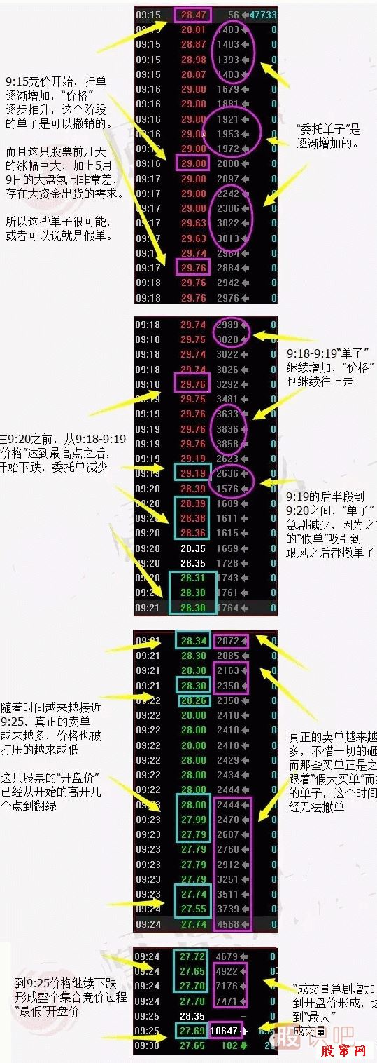 9:15—9:20:這五分鐘是開放式集合競價,可以委托買進和賣出的單子。這段時間是可以撤單的,因此這個時間段你看到的活躍個股的成交量基本上都是假的,因為很多大單是故意掛的,他們會在9:19:30之后撤單,根據(jù)開盤價的最大成交量原則,撤單后成交量最大的價格會被打下來很多。
