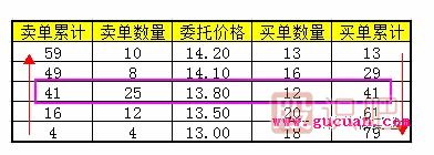 比如上圖:從13.00-14.2的價格委托的買單和賣單,要達成在某一個價格形成的成交量最大,從圖上不難看出在13.80的價格能達成的成交量是最大的,41手!而其他的位置都小于41手,比如在13.00的價格最多能成交4手,在14.10的價格最多能成交29手。