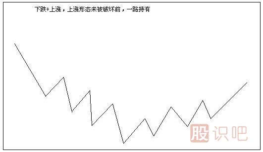 第二種,在下跌結(jié)束后轉(zhuǎn)為上漲或盤整的開端介入。前面的一個下跌走勢的結(jié)束,最典型的標志是不創(chuàng)出新的低點,而后面的走勢類型,是上漲或者盤整,是不可知的,都有可能。當下,我們無需去思考去分析后面是什么