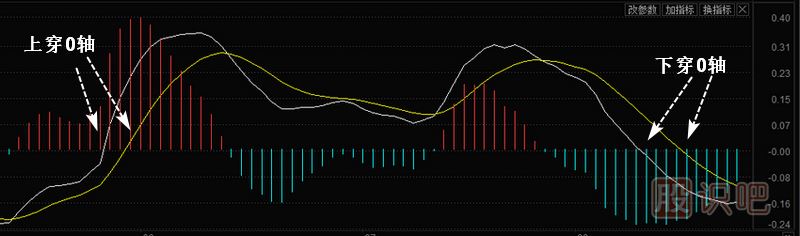 ③0軸在指標(biāo)中一般代表多空力量的分水嶺,0軸之上表示多頭市場(chǎng),0軸以下表示空頭市場(chǎng)。0軸交又又分為兩種情況,如圖4所示:一種是指標(biāo)曲線由下向上穿越0軸,表示股價(jià)由弱勢(shì)轉(zhuǎn)為強(qiáng)勢(shì),行情看多,是買入的信號(hào);另一種是指指標(biāo)曲線由上向下穿越0軸,表示股價(jià)山強(qiáng)勢(shì)轉(zhuǎn)為弱勢(shì),行情看空,是賣出的信號(hào)。