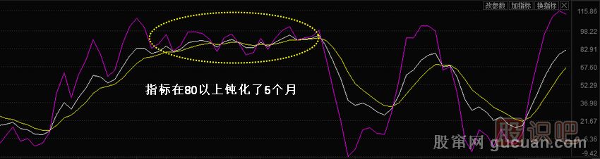 但是,在市場(chǎng)強(qiáng)勢(shì)或弱勢(shì)特征明顯的時(shí)候,會(huì)出現(xiàn)指標(biāo)鈍化的現(xiàn)象,如圖2所示。指標(biāo)鈍化分為兩種:高位鈍化和低位鈍化。高位鈍化是指著股價(jià)的上升,指標(biāo)也會(huì)隨之上升,但指標(biāo)上升的速度會(huì)越來越慢,會(huì)形成上升拋物線的形態(tài)一直在超買區(qū)域(80以上)中運(yùn)行生低位鈍化則正好相反。此時(shí),常規(guī)做多或做空的操作原則就不適用了。解決的方法可以通過使用趨勢(shì)類型的指標(biāo),以趨勢(shì)的轉(zhuǎn)折點(diǎn)作為操作的依據(jù)。