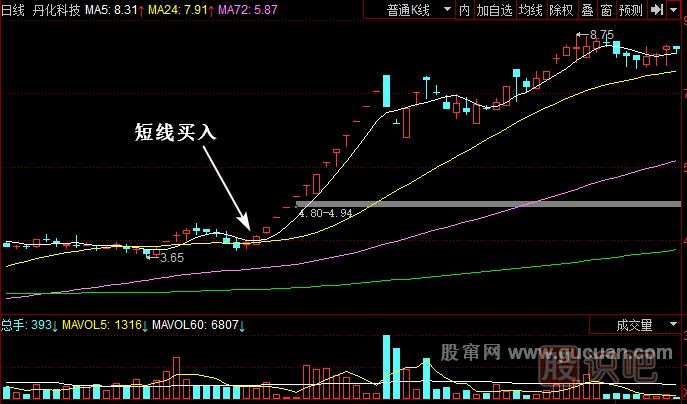 (2)當(dāng)5日線和24日線形成一種漂亮的形態(tài)時(shí),加速上漲就非常近了,采取快速買入是最好的方式。