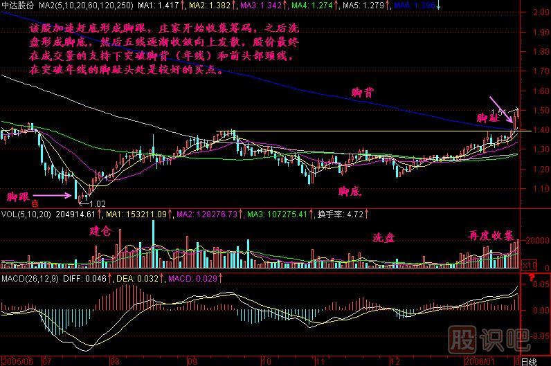 完整的赤腳圖形實(shí)際上是莊家完整的建倉(cāng)過(guò)程。由于這種圖形往往是莊股啟動(dòng)前的征兆,被股民戲稱赤腳大仙。遇到赤腳大仙時(shí),買入太早了,怕赤腳大仙再睡一大覺(jué);買入太晚了,又怕赤腳大仙飛奔。合適的買入位置,在股價(jià)放量沖過(guò)年線至前頭部E點(diǎn)之間。