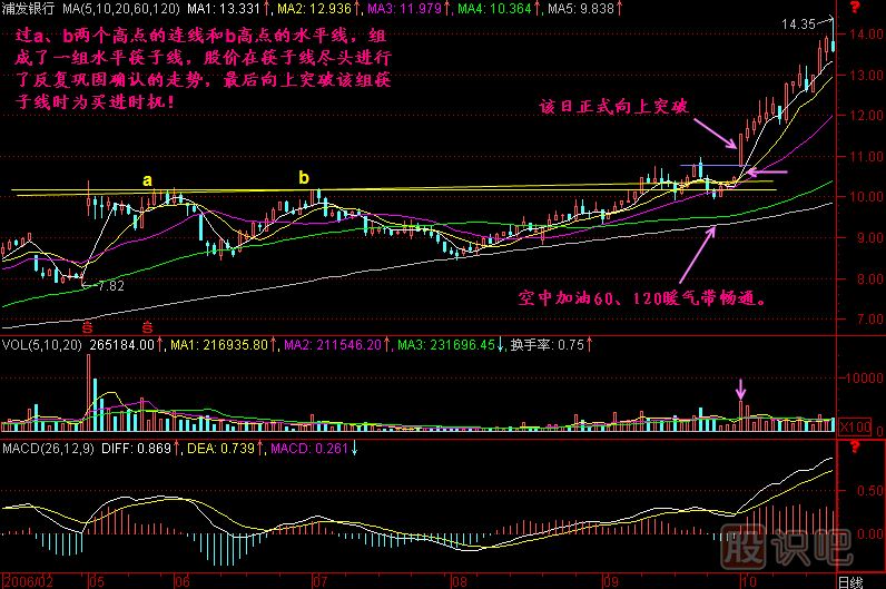 小結(jié):筷子線是廣通經(jīng)典技術(shù)之一!當(dāng)股價(jià)在筷子線之下運(yùn)行時(shí),處于莊家建倉(cāng)洗盤(pán)區(qū)間,漲幅小,而一旦股價(jià)放量突破筷子線,則說(shuō)明該股已經(jīng)進(jìn)入拉升期了,股價(jià)離開(kāi)筷子線的速度往往很快,因?yàn)?u>莊家要擺脫散戶,不想讓散戶在靠近自己建倉(cāng)的成本區(qū)附近追漲,他希望散戶到高位來(lái)接盤(pán),但在廣通我們就等在筷子線上,你要么別突破,你繼續(xù)建倉(cāng),我們不管,一旦你突破,我們就是要追漲!