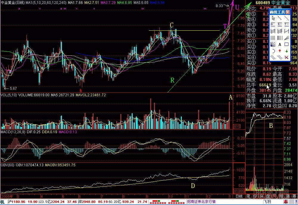 收盤后,見(圖223-3)所示,放量打拐的圖形就直觀得多,A點的成交量柱體圖比5日均量線高出2倍有余,明顯放量。日k線原來的上升速度是R至S的斜率,現(xiàn)在拐成T至U的斜率,顯然是加速度上升。您如果在上午10:09的時候買入,正好打擊在拐點上,故稱為放量打拐。