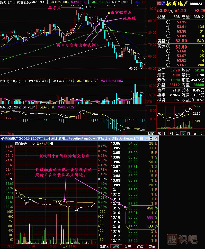 小結(jié):莊家在頭部區(qū)間出貨有一個(gè)臨界點(diǎn),這個(gè)臨界點(diǎn)之前股價(jià)是緩慢滑跌,屬于潛派發(fā),而這個(gè)臨界點(diǎn)之后股價(jià)往往快速下跌,屬于強(qiáng)派發(fā),此時(shí)股價(jià)往往出現(xiàn)了三死叉見頂、價(jià)壓、斷頭鍘刀、空方炮等等圖形,這個(gè)時(shí)候最容易出現(xiàn)巨量拋盤誘發(fā)大跌勢的情況,如果在盤中發(fā)現(xiàn)這樣的情況,可得要抓緊時(shí)間出貨,否則股價(jià)將會(huì)加速下跌,如果不及時(shí)出貨很容易會(huì)被高位套牢!
