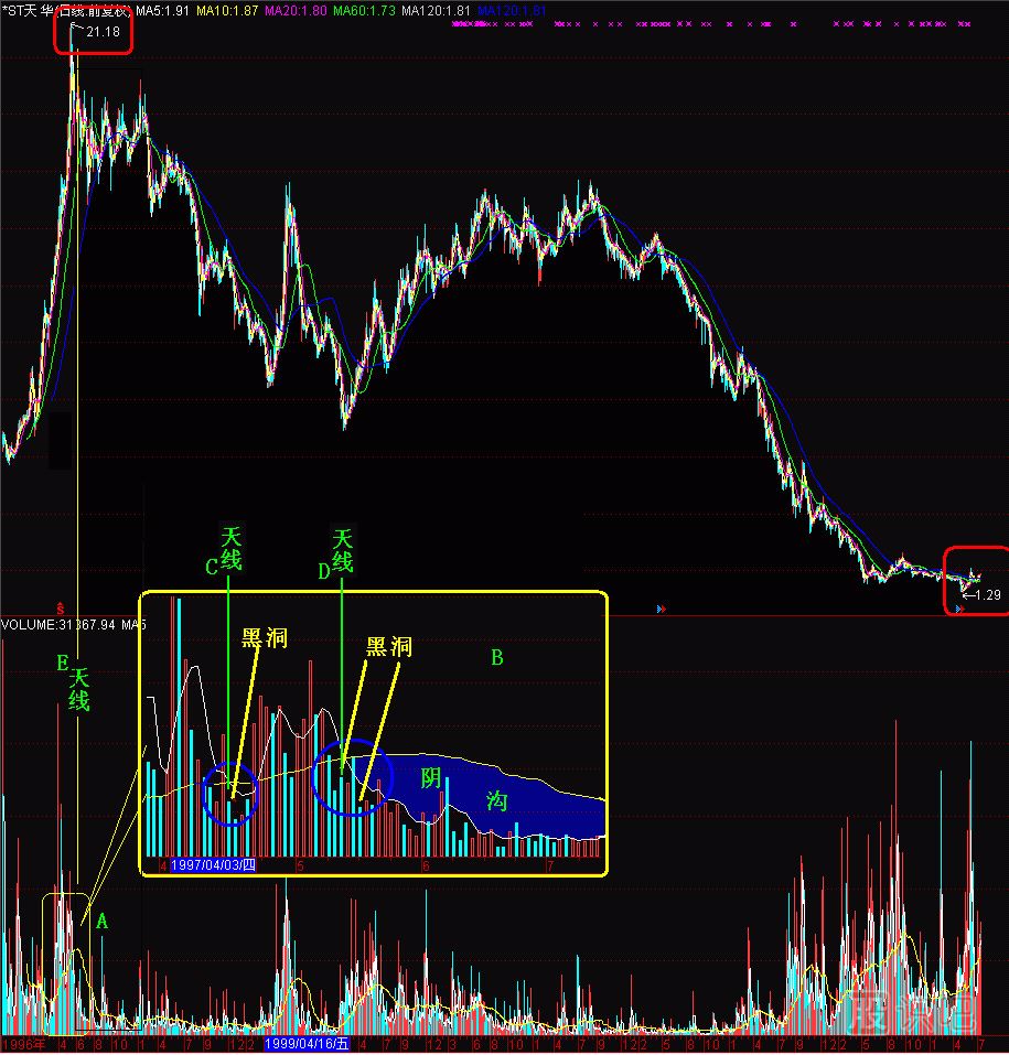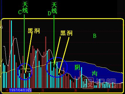 (圖291-2)中,B方框是放大了的A方框,C天線和D天線由于相隔距離很小,在A方框中,合并成E天線了。沿著E天線向上,是21.18元的天價(jià)區(qū)。E天線附近巨大的成交量無法推動股價(jià)繼續(xù)上升,反而出現(xiàn)“黑洞”,這是明顯的出貨信號。“黑洞”以后有“陰溝”,它是5日、60日量均線的“冷空氣帶”,為了便于分別,在量均線上叫“陰溝”。“大江大河不翻船,翻船翻在陰溝里”,許多股民就是見了“陰溝”往里鉆,結(jié)果翻了船。由于“陰溝”圖形是跟著“黑洞”的,因此,統(tǒng)稱“黑洞陰溝”,都不是好聽的名詞,也不是炒股的好地方,在這里炒股的人不是被“黑洞”吞噬,就是在“陰溝”翻船,難有逃脫的。