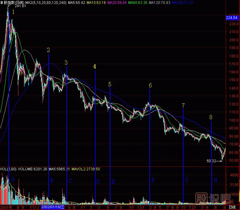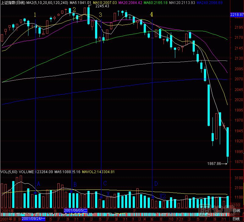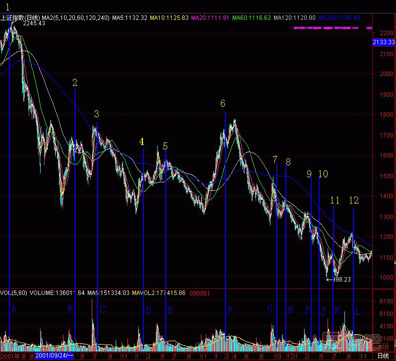 這就是2001年5月22日的2210點(diǎn)到2001年7月10日的2189點(diǎn)的情景。當(dāng)市場還處于一片看好后市的歡呼聲中時,我們開始清倉撤出股市,并組織旅游隊(duì)外出旅游,以防又殺回股市。2001年7月6日晚,我還寫了《滬深兩市已經(jīng)進(jìn)入空頭市》,引來無數(shù)罵聲。我顧不得挨罵了,要把頭部告訴更多的人,以后每周一篇空頭文章,最終被罵為“黑嘴”。