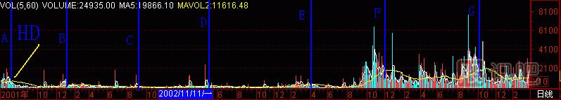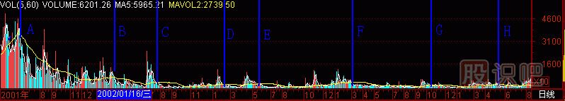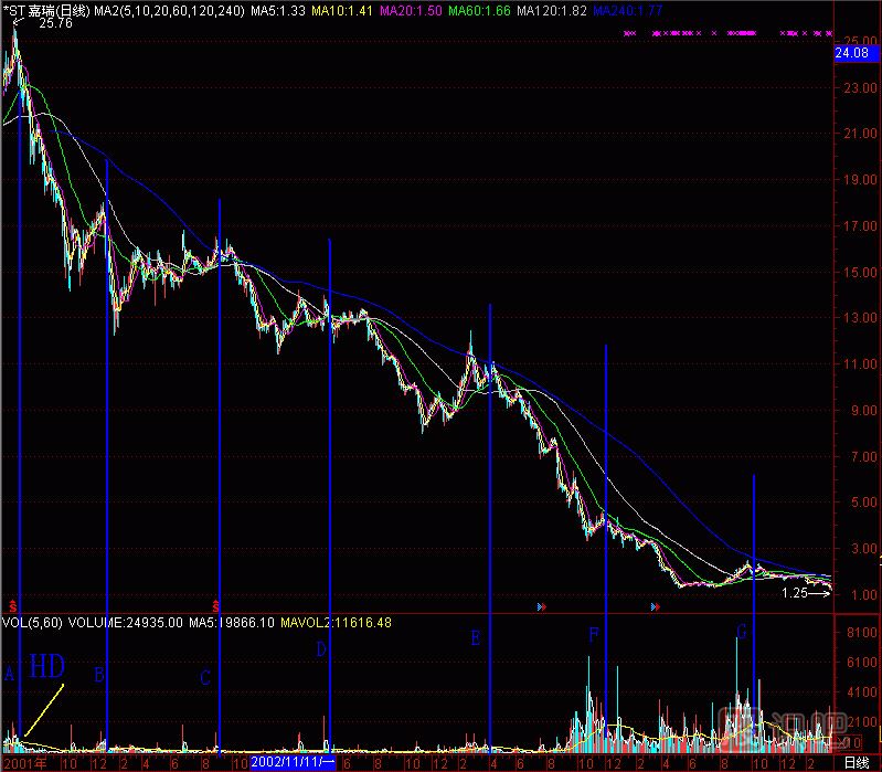 再找個股做試驗(yàn),(圖291-18) *ST嘉瑞000156的成交量柱體圖上有A至G共7個黑洞,拉起7根天線,對應(yīng)了7個頭部。也就是說,在25元處沒逃走的話,以后“黑洞”又給你6次逃跑機(jī)會,只要逃,就不會遭受跌到1.25元的悲慘下場。