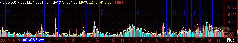 第二步實(shí)驗(yàn),把以上成交量柱體圖上方的相對應(yīng)的K線圖掛出來,看看“黑洞”拉出來的“天線”指向K線的頭部還是底部?還是其它部位?觀察“黑洞”是否“吞噬”一切靠近它的“能量”?做多力量被“吞噬”后,股價(jià)能不能上升了?可怕的股價(jià)頭部是不是形成了?每一個“黑洞”是不是對應(yīng)每一個股價(jià)頭部?