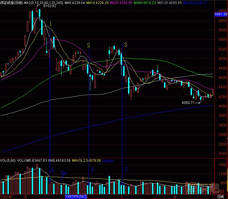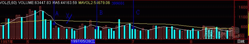 也許會有人問,“黑洞”對深成指頭部預(yù)測效果如何?請看,(圖291-13) 對應(yīng)(圖291-5)深圳成指日K線的全圖。(圖291-13)的成交量柱體圖上有A、B、C三個“黑洞”,那時,我們還不知道這成交量柱體圖是哪個股票的,現(xiàn)在明白了,是深成指的。天線A、B、C對應(yīng)的日K線圖,是:A天線對應(yīng)5日、10日價(jià)均線死亡交叉1,B天線對應(yīng)5日、10日價(jià)均線死亡交叉2,