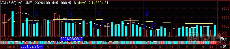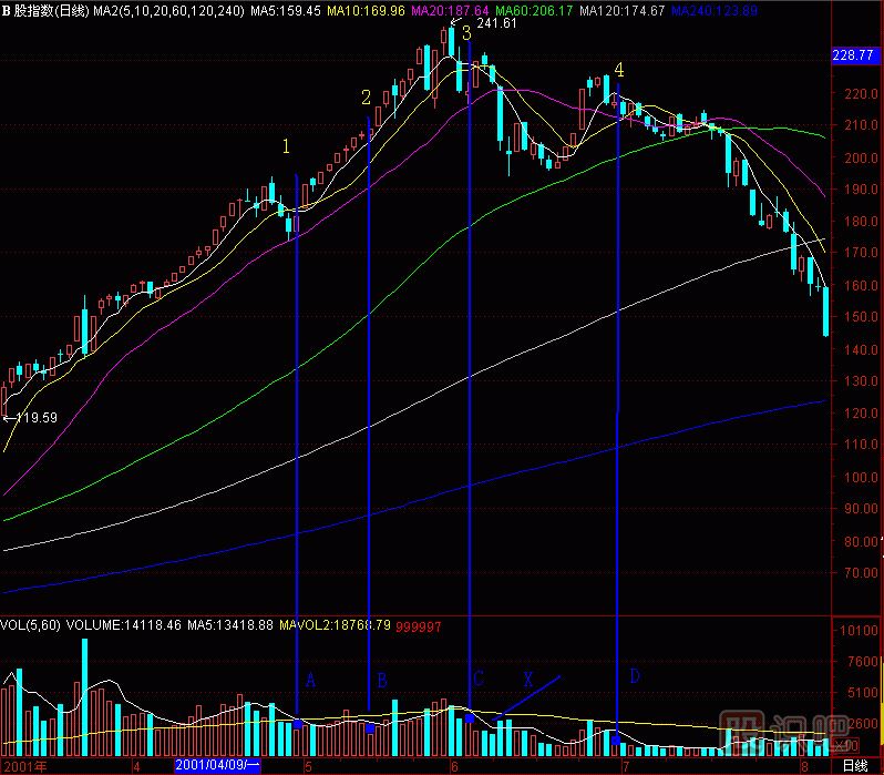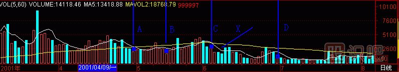 再到上海B股指數(shù)上作試驗(yàn),(圖291-15)成交量柱體圖上有A、B、C、D四個“黑洞”,各自拉起一根天線,對應(yīng)1、2、3、4個K線位置,正好是上海B股指數(shù)日K線的241點(diǎn)頭部區(qū)間,在這里清倉是何等快樂呀!