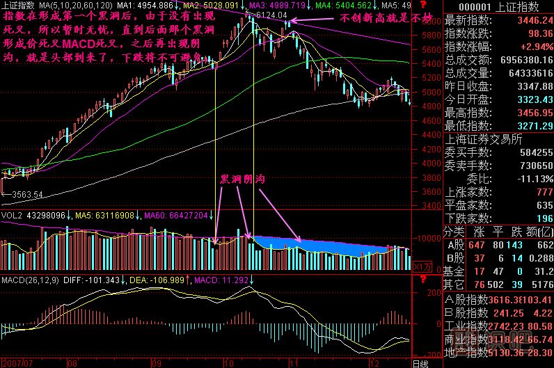 需要強(qiáng)調(diào)的是,在成交量形成黑洞之后,如果股價(jià)同步形成死叉或者價(jià)壓,則頭部下跌已經(jīng)不可避免。