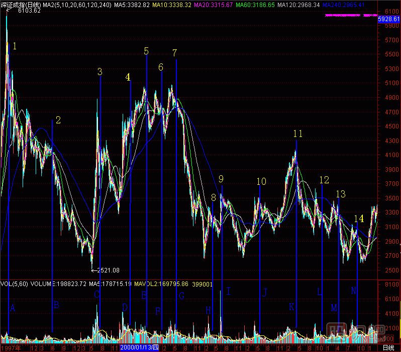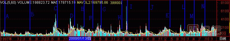 深圳成指從5091點(diǎn)跌到2590點(diǎn)的過程中,“黑洞”預(yù)報(bào)“頭部”效果如何?請看(圖291-14)深圳成指成交量柱體圖上有A至N共14個“黑洞”,拉出14根天線,對應(yīng)14個深圳成指的頭部。不多不少,不偏不倚,全部對準(zhǔn)。