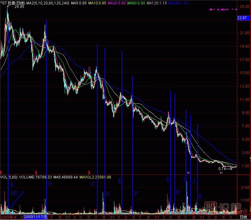 再找個股做試驗(yàn),(圖291-17) *ST托普000583的成交量柱體圖上有A至K共11個黑洞,拉起11根天線,對應(yīng)了11個頭部。也就是說,在24元處沒逃走的話,以后“黑洞”又給你10次逃跑機(jī)會,只要逃,就不會遭受跌到0.74元的悲慘下場。