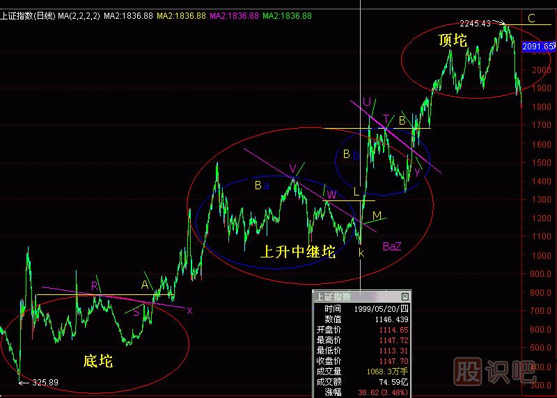 本例中“上升中繼坨”是由兩個(gè)小“坨”組成的,它們是“Ba坨”和“Bb坨”。一般來(lái)說(shuō),在“底坨”和“頂坨”之間,可能出現(xiàn)許多小“坨”。只要它們的功能是“上升中繼”,都可合并為一個(gè)大的“上升中繼坨”。(圖286-4)中“Ba坨”的筷子線是WL和WV,向上突破后,發(fā)生LU的一波行情,這就是我和左安龍作電視節(jié)目所預(yù)測(cè)的那一波行情。“Bb坨”的“筷子線”是TB和TU,在Y點(diǎn)附近,是洗盤(pán)的最后階段。成交量充分萎縮,下跌空間越來(lái)越小,一輪行情呼之欲出。這里是2000年1月1日,記者夏雄偉采訪我后寫(xiě)了《未來(lái)行情高不可測(cè)》一文,刊登在《證券時(shí)報(bào)》上。由于“Bb坨”向上突破,既是對(duì)“Bb坨”的突破,又是對(duì)整個(gè)“上升中繼坨”的突破,是雙重“坨突破”,更具技術(shù)意義,所以這次預(yù)報(bào)的“底氣”是十足的,我頂著空方輿論壓力,獨(dú)唱多調(diào)。事實(shí)證明,這輪行情一漲就是一千點(diǎn),千年之交成功地預(yù)測(cè)了“千點(diǎn)行情”。