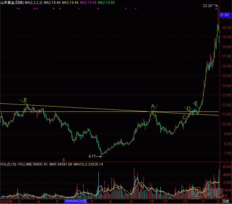 清華同方的股價(jià)從B點(diǎn)的10.11元,經(jīng)過(guò)11個(gè)月的下跌,到達(dá)C點(diǎn)的5.92元,成交量極度萎縮。顯然,整個(gè)B、C和最低點(diǎn)3.46元的大三角形,是莊家收集籌碼的“底坨”,既然是“底坨”,等待洗盤(pán)完畢后,就必然會(huì)展開(kāi)主升浪。從A點(diǎn)作“水平攔截線”,就取得D點(diǎn)的買(mǎi)入點(diǎn),用前高點(diǎn)B和A點(diǎn)作“斜下攔截線”,就取得C點(diǎn)的買(mǎi)入點(diǎn)。這樣,筷子線就形成了。而那天收盤(pán)后做電視節(jié)目時(shí),股價(jià)已觸及B、A“斜下攔截線”。因此判斷,股價(jià)有向上突破“筷子線”展開(kāi)主升浪的可能。