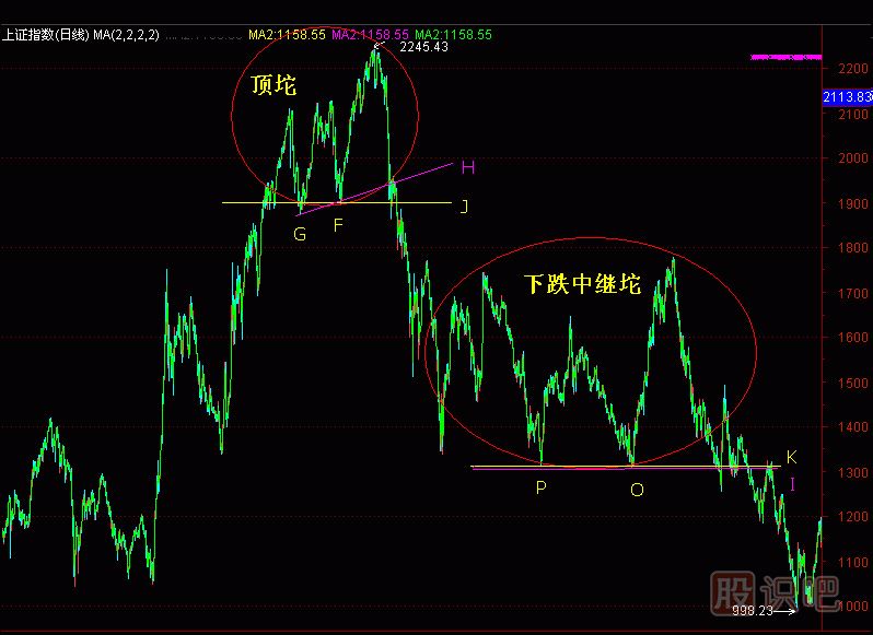 (圖286-5)是上證指數(shù)從2245點(diǎn)跌到998點(diǎn)的日K線圖。 “頂坨”的低點(diǎn)F作“水平攔截線”,得到J點(diǎn)攔截點(diǎn)。另一個(gè)低點(diǎn)G與F作“斜上攔截線”,得到H攔截點(diǎn)。這兩條線就是“筷子線”。當(dāng)上證指數(shù)從“頂坨”跌破H點(diǎn)后,發(fā)生了“坨突破”,這時(shí)應(yīng)準(zhǔn)備清倉(cāng)出貨。當(dāng)上證指數(shù)跌破J點(diǎn)后,意味�派現(xiàn)ぶ甘黃�“筷子線”的支撐,向下破位。破位后的跌勢(shì)往往是勢(shì)不可擋,一泄一大截。“頂坨”向下破位這段行情,是我們必須躲避的行情,否則損失是巨大的。