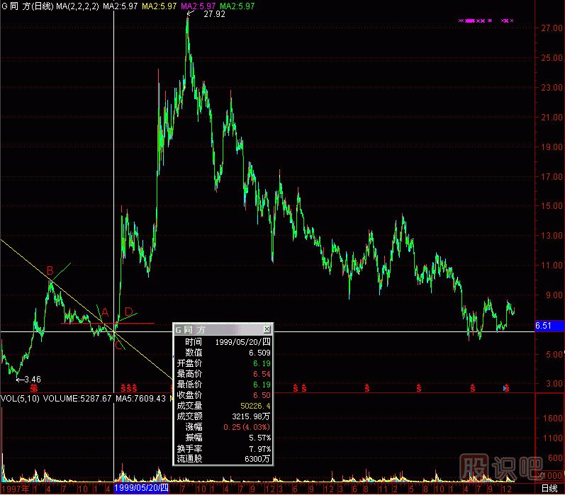 老師:現(xiàn)在分析1999年5月20日清華同方的K線圖,見(jiàn)(圖286-3)。