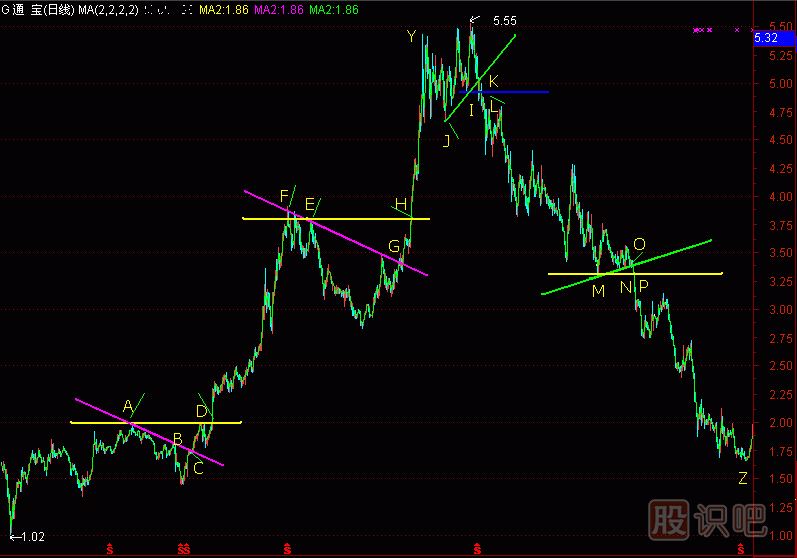 “頂坨”的低點(diǎn)I作“水平攔截線”,得到L攔截點(diǎn)。I、J作“斜上攔截線”,得到k攔截點(diǎn)。當(dāng)股價(jià)跌破K點(diǎn)準(zhǔn)備清倉(cāng)賣(mài)出,當(dāng)股價(jià)跌破L點(diǎn),就應(yīng)該完全清倉(cāng)。最好的安排是長(zhǎng)途旅游,遠(yuǎn)離股市。因?yàn)?ldquo;頂坨”的“筷子線”一旦失守,股價(jià)將有長(zhǎng)期下跌,此時(shí)多動(dòng)多輸,少動(dòng)少輸,不動(dòng)不輸。