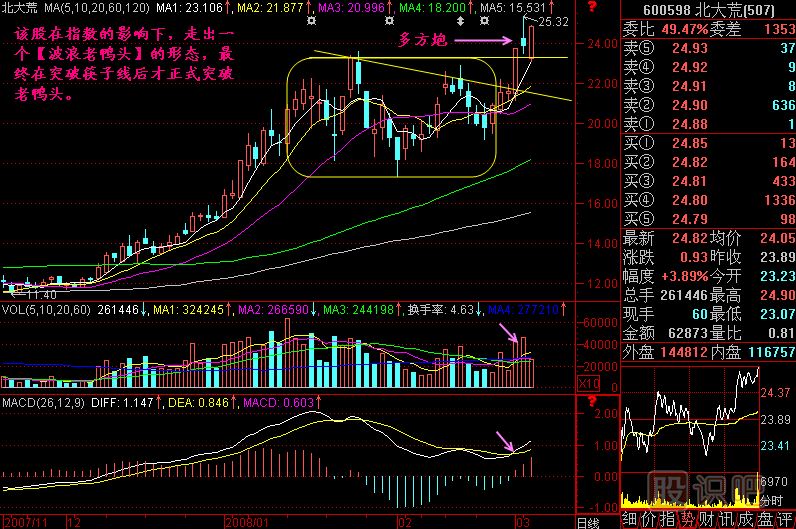 像這種波浪形的“老鴨頭”,一旦向上突破,漲勢凌厲。為什么呢?因為它的“波浪”形盤整蓄勢時間,比單一的老鴨頭要長得多,莊家的準備工作做得更充分。