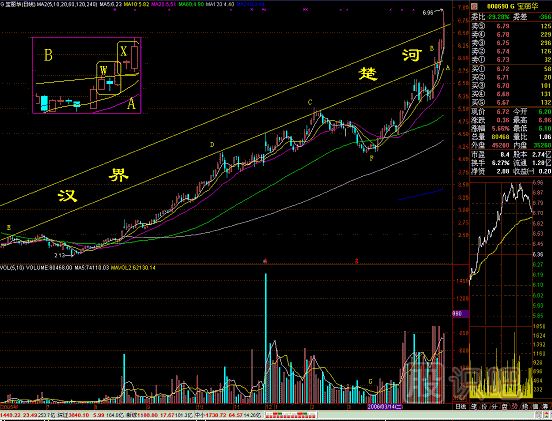 怎么殺過去呢?這里采用“雙炮過河”的形態(tài)。將A、B區(qū)間放大后,放在左上角?,F(xiàn)在我們看清楚了,多方在楚河線下先作“兩陽夾一陰”“多方炮”圖形,見W處,攻擊前充分盤整,然后一炮過楚河,又是“多方炮”形態(tài),見X處。在這里用“兩陽夾一陽”,比“兩陽夾一陰”稍強(qiáng)勢。兩個(gè)“兩陽夾一陰”應(yīng)該是六根K線,這里是五根K線,原因是中間共用一根長陽線,形成“三陽夾兩陰”這種組合“多方炮”,進(jìn)攻速度加快。一旦多方越過楚河,就在河對(duì)面大開殺戒,不沖殺一程是不肯收兵的。研究過楚河的各種形態(tài),就是為了把握住過楚河的時(shí)機(jī),在這里買進(jìn)股票,風(fēng)險(xiǎn)小,收益大。
