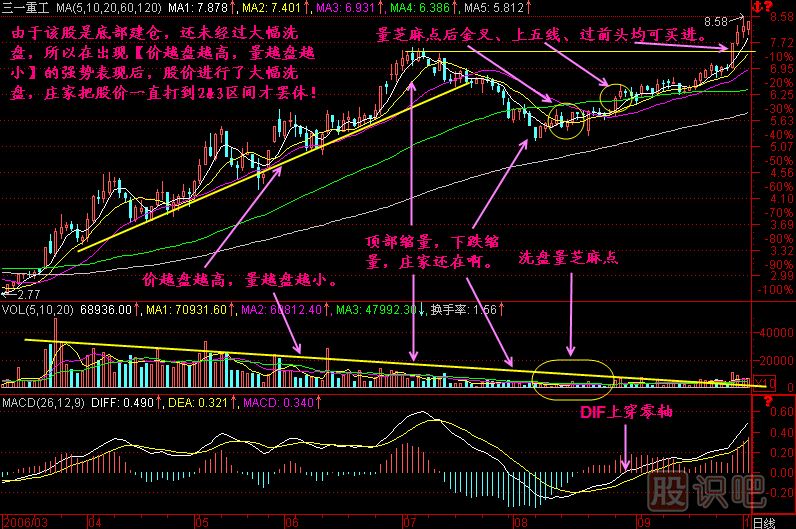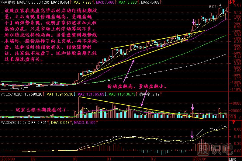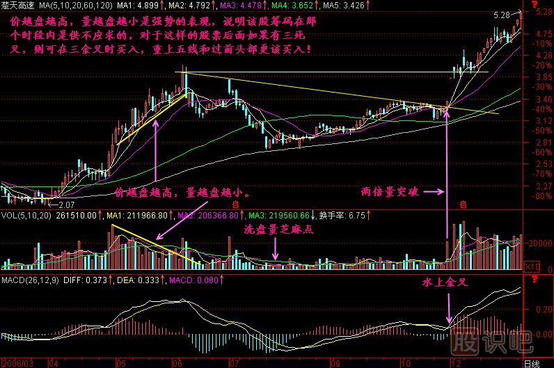 小結(jié):價(jià)越盤越高,量越盤越小是強(qiáng)勢的表現(xiàn),表明該股的籌碼處于供不應(yīng)求狀態(tài),表明莊家對該股看好的程度,當(dāng)然這其中也會混入大量的散戶,所以這樣的走勢后面不排除有借指數(shù)回檔洗盤的可能,不管是否洗盤,我們都有辦法對付它,如果三死叉洗盤的話,我們就等待三金叉買入,或者重上五線買入、過前頭買入,總之這樣的股票如果在低位被發(fā)現(xiàn),是不能放過的!