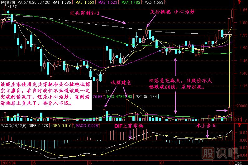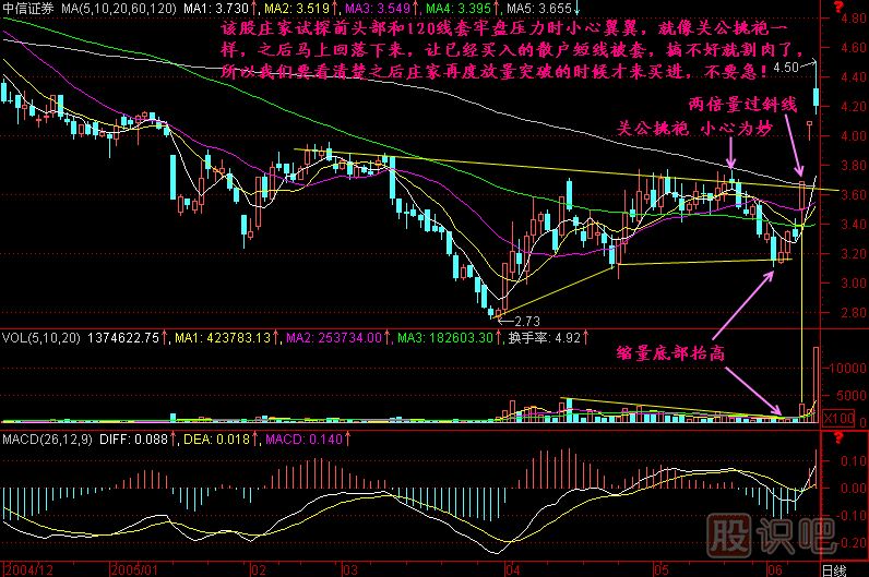 小結(jié):120日均價(jià)線是半年線,在這里往往會(huì)遇到解套壓力,也許這里也正好是前面下跌過程中的一個(gè)平臺(tái)區(qū)域,如果該股有莊家要建倉,他一定要試探一下,看看上面有多少籌碼要拋出來,但他這個(gè)試探動(dòng)作不像尖兵穿刺那么明目張膽的放量直接穿刺,他這個(gè)使用的是縮量、小心翼翼地靠近敵方的城墻邊,在那里悄悄刺探一下城里邊的情況,相當(dāng)?shù)男⌒?,之后就會(huì)回落下來,根據(jù)情況再做后面的操盤計(jì)劃。