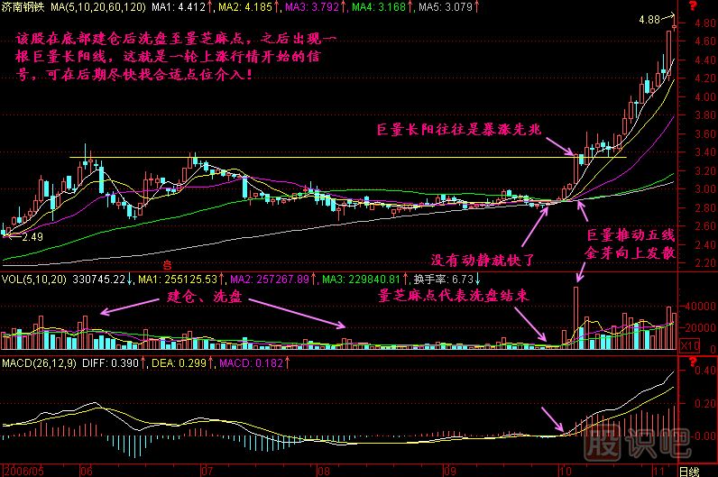 小結:當一只股票暴露出莊家建倉的痕跡后,一旦放巨量向上突破平臺,則是大漲的開端,起碼要走一段路,否則莊家沒法出貨,這就叫巨量長陽往往是大漲的開端。