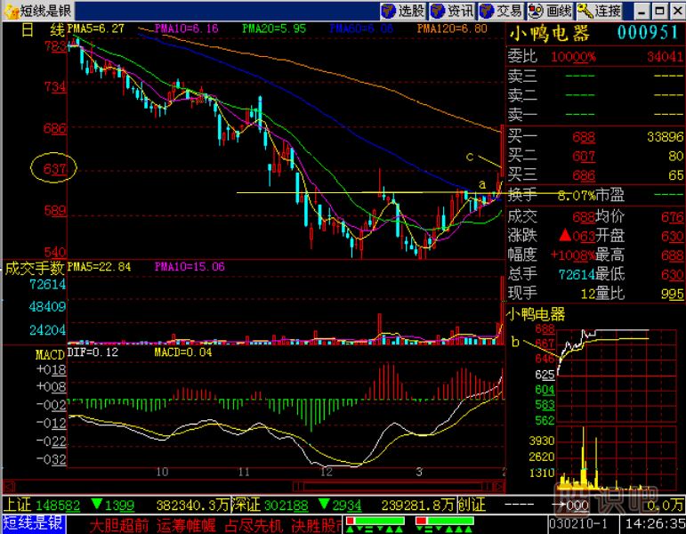 000951小鴨電器現(xiàn)在拉出了第一個漲停板,相當干脆,我們拿下了開年以后第一個漲停板。理由是什么呢?就是年前它就已做好了突破形態(tài),在a點已經(jīng)沖過T線了,今天的跳空高開拉升意愿相當明顯。只要它在行進中一路往上漲,我們就應該堅決建倉,在這個地方建倉,實際成本和莊家差不多。見(圖213-1)。