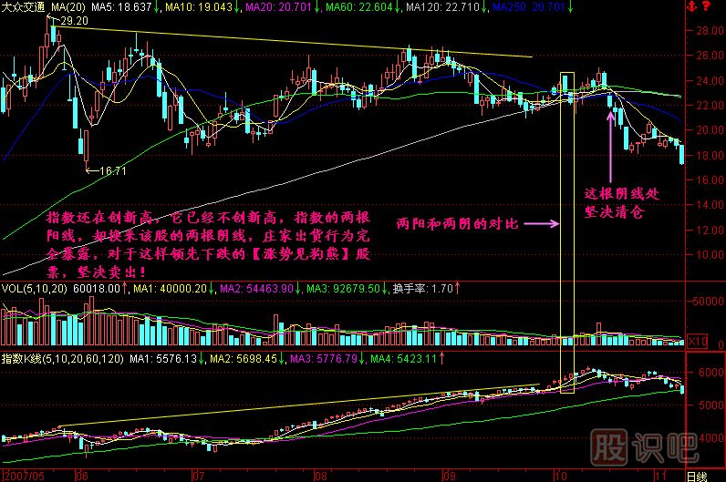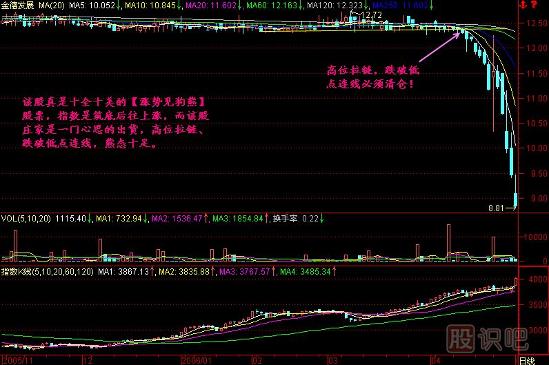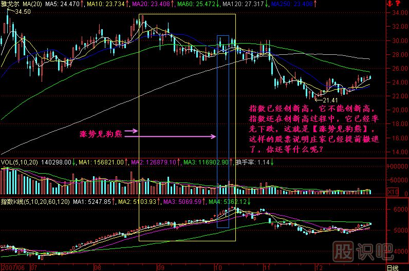 第一,指數(shù)走得很強你卻不漲,那就說明你在出貨,對不對?如果里邊的莊家想要做一個大行情,那指數(shù)漲的時候股價就應(yīng)該水漲船高,呼風(fēng)喚雨地往上拉,怎么會出貨呢?肯定是這個股票出了什么問題,我這樣分析有沒有道理?因此說,漲勢見狗熊跟我們原來說的跌勢見英雄正好相反,在指數(shù)大跌的時候那些會漲的紅頭股票就是英雄,在指數(shù)大漲的時候那些會跌的綠頭股票就是狗熊,應(yīng)該堅決出貨!