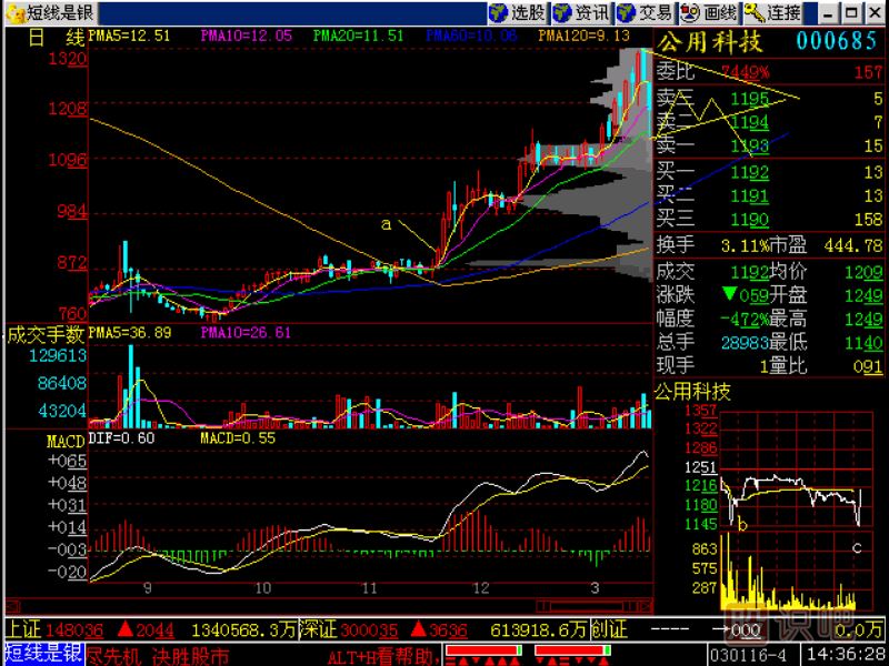 剛剛收到一個Email,是一個外地學(xué)員發(fā)過來的,他說在8.8元(圖中a點)買進了公用科技,見(圖202-1)所示。在當(dāng)時買進還是不錯的,因為放量過前頭,這是對的,沒做錯。他一直捂到現(xiàn)在,可是本周不換股票就做錯了。他這么講,他以為昨天會漲上去的,沒想到今天一個低開,怎么辦?這個問題很簡單,在本周指數(shù)漲得很好,指數(shù)大漲情況下,這個股票卻連跌兩根陰線,這就是漲勢見狗熊!