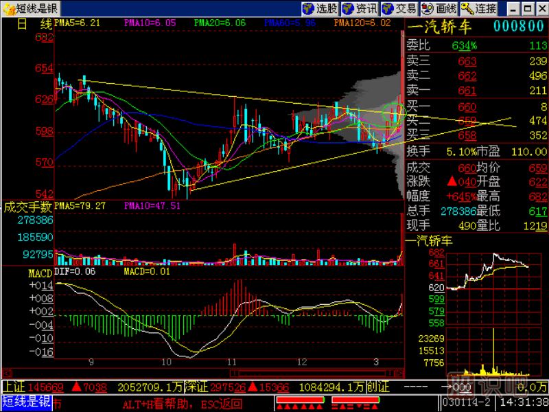 多方炮后面開炮往往有兩種情況:一種是早晨開盤后還不覺得怎樣,突然之間就拉起來;還有一種是直接跳空高開,那就是巨量跳空,回檔買進!這個圖形還有一個特殊性,就是一個長期的三角形盤整帶被多方炮突破,這個時候它推出去的力量相當大,這是一種噴發(fā)性的力量,因為那么長時間以來股價一直受到這個三角形制約,憋得很厲害,憋得它最后沒有路好走了,要么往上突破,要么往下突破??墒俏覀冎?,《十九強》跟蹤一汽轎車已經(jīng)有兩年多了,我們一直說它是莊股,大家說是不是?我們公開在中央電視臺講過,在《十九強技術》講座里講過,在網(wǎng)站上也講過,就是講一汽轎車是莊股。為什么?因為它在《十九強》里面表現(xiàn)得非常強烈,經(jīng)常處于《十九強》第一名。既然它是莊股要做上去,那就決定了它要么不突破,要突破就是往上突破,不可能往下突破。