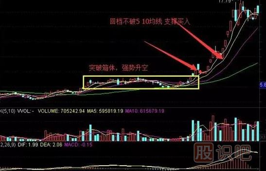 股價(jià)脫離底部區(qū)域,某一天突然放出巨量,股價(jià)跳空而起,隨后幾天股價(jià)開(kāi)始回踩,等待5日或10日均線慢慢跟上時(shí),股價(jià)再次回踩5日或10日均線,投資者可在回踩當(dāng)天買(mǎi)進(jìn),第二天或第三天,通常會(huì)以大陽(yáng)線突破