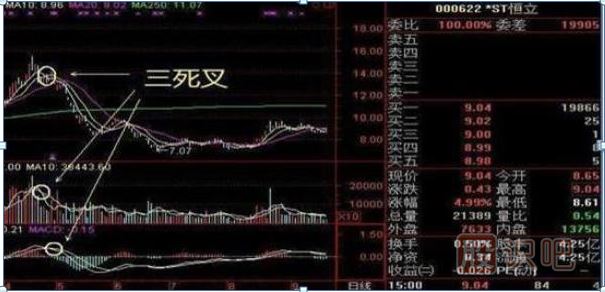三死叉,也就是說(shuō)當(dāng)股價(jià)均線、成交量均線、MACD指標(biāo)都出現(xiàn)三死叉的時(shí)候,此時(shí)應(yīng)該果斷賣(mài)出??聪聢D中的st恒立,出現(xiàn)三死叉后股價(jià)一路下滑。
