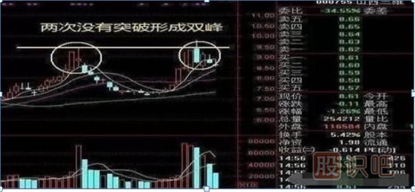 股價(jià)連續(xù)兩次沖擊某個(gè)價(jià)位都出現(xiàn)了回落,K線組合看起來(lái)就是兩個(gè)高高的雙峰。像山西三維就是這個(gè)走勢(shì),近期兩次沖擊9.5沒(méi)有成功,股價(jià)只能順勢(shì)回落。