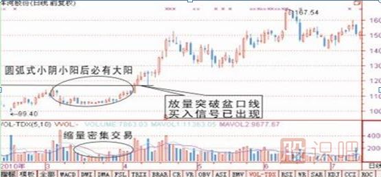圓弧形態(tài)一般出現(xiàn)在調(diào)整后或者橫盤(pán)整理挖坑后走出的圖形,從技術(shù)形態(tài)上看有二個(gè)特別現(xiàn)象是: