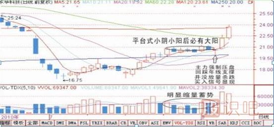 對(duì)于一般穩(wěn)健投資者來(lái)說(shuō),或者是不喜歡追漲,選擇此類(lèi)小陰小陽(yáng)蓄勢(shì)待發(fā)的圖形,當(dāng)發(fā)現(xiàn)時(shí)逢低買(mǎi)進(jìn)持股不到一周必會(huì)大陽(yáng)突破,享受上升浪賺錢(qián)的樂(lè)趣。