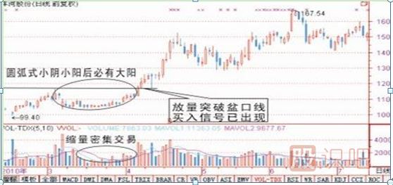 一個(gè)是在圓弧底位會(huì)出現(xiàn)密集交易區(qū),(密集交易就是說(shuō)持續(xù)幾天的K線長(zhǎng)短差不多);