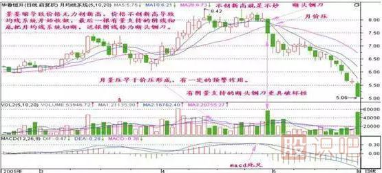圖形特征:當(dāng)股價(jià)在高位盤整后漸漸下滑,此時(shí)5日、10日和20日均線形成的均線系統(tǒng)呈現(xiàn)收斂狀態(tài)。此時(shí)如出現(xiàn)一根陰線跌破三條均線形成一陰斷三線的“斷頭鍘刀”,則應(yīng)警惕有一輪跌勢(shì)。特別是帶有較大成交量的陰線,則更有下跌的可能。