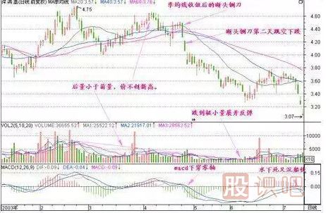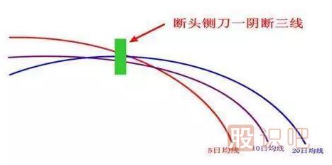 當(dāng)5日、10日和20日內(nèi)買進(jìn)股票的平均成本越來(lái)越接近時(shí),人們發(fā)現(xiàn)早買或遲買股票一樣都無(wú)可盈利,購(gòu)買股票的迫切性降低。而市場(chǎng)另一方面賣出方已明顯感到購(gòu)買力降低,愿意用更低的價(jià)格出售股票。于是有一天賣出方突然用低于三條均線的價(jià)格大量賣出,當(dāng)日收盤價(jià)跌破三條均線,形成“斷頭鍘刀”。5日、10日和20日內(nèi)買進(jìn)股票的人突然發(fā)現(xiàn)已被套牢,先知先覺(jué)者在第二天行情中愿意用比“斷頭鍘刀”這根陰線收盤價(jià)更低的價(jià)格沽出,于是發(fā)生空殺空行情。此時(shí)股票供應(yīng)量急驟增加,而股票需求量急驟減少,終于誘發(fā)一輪跌勢(shì)。
