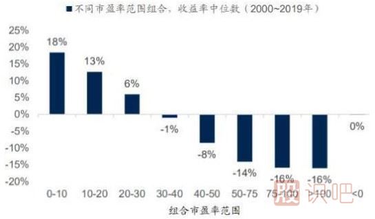 市盈率0到10倍的為一組,10到20倍的為一組,20到30倍的為一組,30到40倍的為一組,40到50倍的為一組,50到75倍的為一組,1000倍以上的為一組,市盈率為負(fù)(虧損)的單獨(dú)為一組。然后計(jì)算t+1年該組合中股票的年收益率,每年滾動(dòng)換一次樣本,時(shí)間范圍是2000年至2019年。