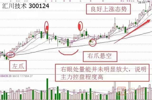 右爪比左爪位置要高。前面的上漲最好是連續(xù)漲停,放出巨量,右爪的量要越小越好,證明洗盤非常成功。突破蛤蟆頭時一定要放量。