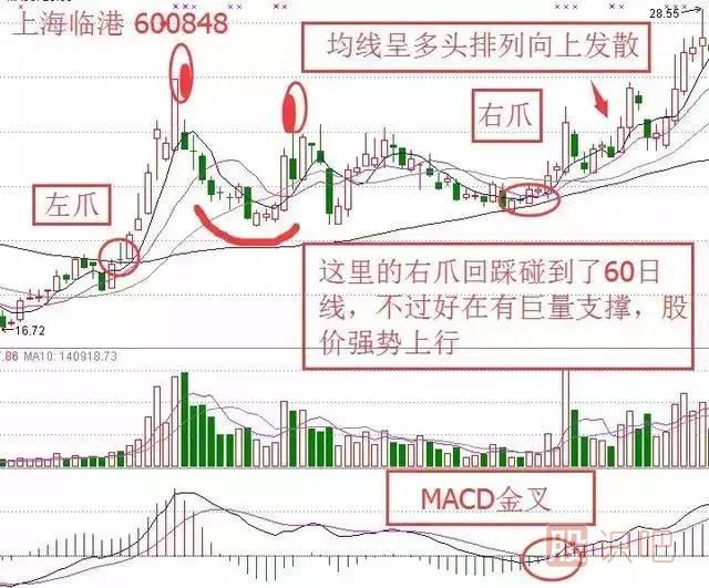 其實從形態(tài)上來說,右眼位置有點變形,但是還是能看出“金蛤蟆”形態(tài)。同樣的,在60日附近該股股價開始啟動,形成蛤蟆左爪,幾根放量陽線到達一個小高峰,形成蛤蟆左眼。中途回踩至60日線止跌,后再次小放量上攻,形成蛤蟆右眼。此后量能一直維持縮小,當K線再次回踩60日線時量能縮到極致。右爪形成后,MACD金叉釋放看漲信號,隨后一根巨量長陽打開上升通道,均線呈多頭排列向上發(fā)散,股價不斷攀升。