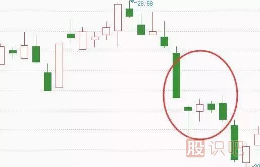 下降三法又稱下跌三部曲,出現(xiàn)在股價(jià)下跌過程中,由大小不等的5根K線組成。這5根K線中,第一根K線為大陰線或中陰線,接下來三根為小陽線,但都沒有向上突破前面第一根陰線的開盤價(jià),之后出現(xiàn)一根大陰線或中陰線,且其收盤價(jià)要低于第一根陰線的收盤價(jià)。