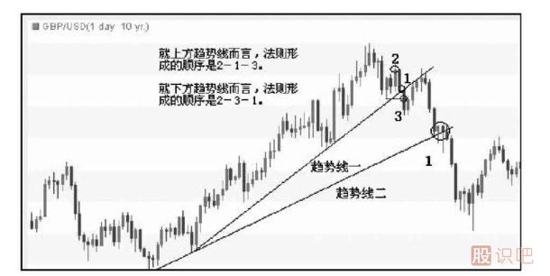 第二個123法則的形成依賴的是趨勢線二,但是法則中需要的高低點仍是第一個123法則提到的高低點。此次,匯價如前未能創(chuàng)下新高(條件2),并且跌破了最高點和次高點之間的低點(條件3),之后匯價才跌破趨勢線二,滿足了條件1。因此其順序是2——3——1。