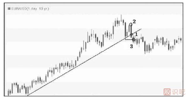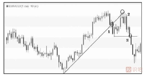 圖1-1是歐元/美元日圖走勢。匯價首先跌破了上行趨勢線,滿足了條件1。之后匯價再次上探前高,未能創(chuàng)下新高,滿足了條件2(高位錄得一根吊頸K線),之后匯價跌破了兩個高點之間低點,即最近低點,滿足了“跌破前低”的條件3。投資者可以選擇匯價在突破低點、滿足第三個條件時做空,這一法則的順序是1——2——3。