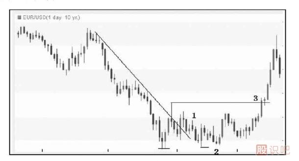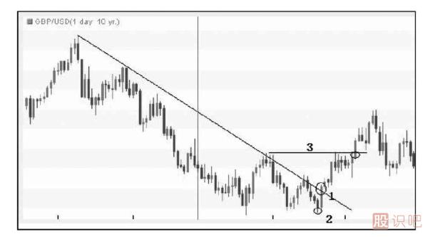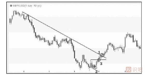 圖1-5是英鎊/美元日圖走勢。匯價受到下行趨勢線打壓持續(xù)下跌,但是創(chuàng)下最低點后,匯價開始反彈,下方的次低點形成(達到條件2)。其后匯價突破了最低點和次低點之間高點(條件3形成),并最終突破趨勢線(達到條件1)。本例中123法則形成的順序是2——3——1。